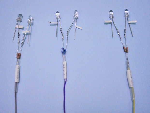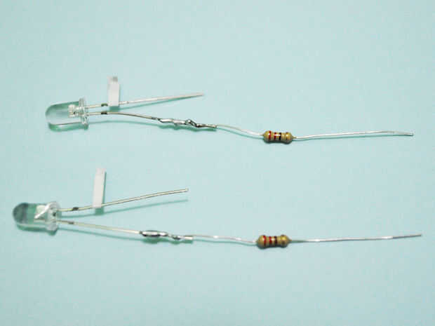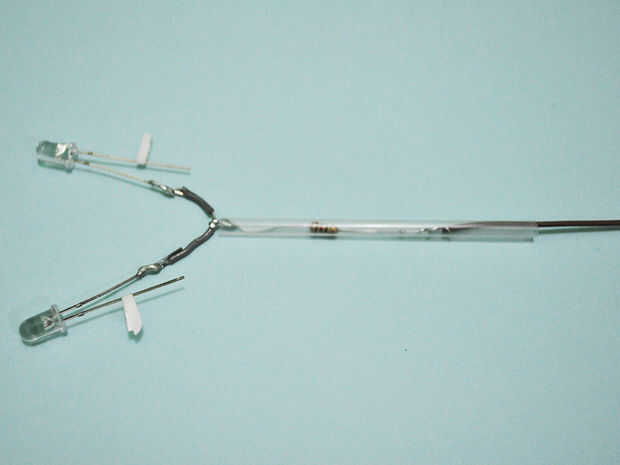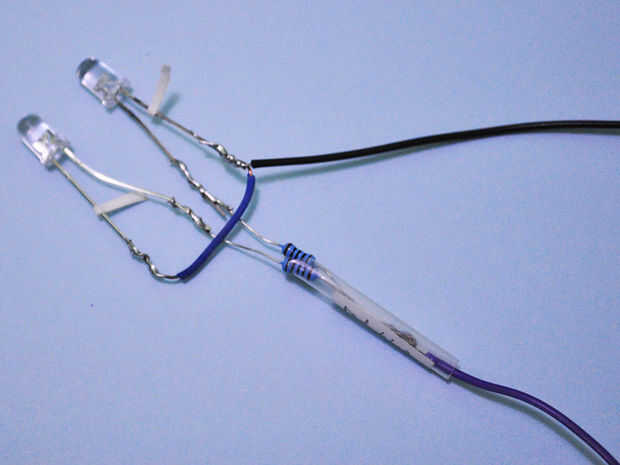 Para la serie de 2 LEDs con 1 resistencia (azul-blanco), soldar los diodos positivos junto con resistencia. Solo olvida un momento cátodo. A soldarlos junto con otros LED, por lo que será más eficiente. (ver imagen 2)