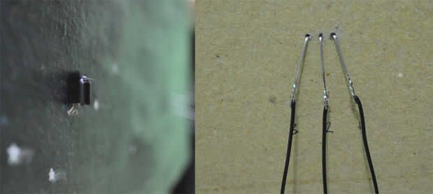 Taladre e inserte el receptor de infrarrojos a través de los agujeros. Luego soldar todos los pines con cables y hacer una nota a bordo sobre la conexión de perno, para que no extravíe. (ver imagen 2)