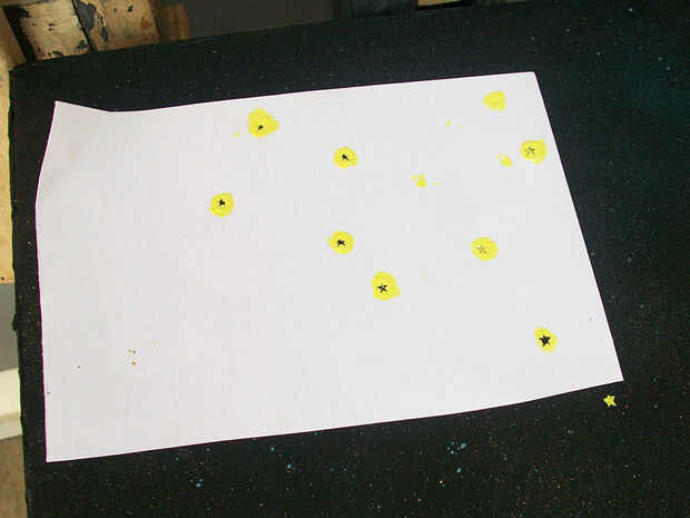 Meter la en forma de estrella con un bastoncillo de algodón, usando color blanco y amarillo para hacer un poco estrellas alrededor de la Junta de papel. (ver imagen 4)
