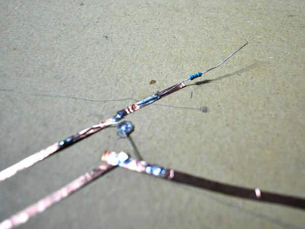 Al final de cada positivo de la resistencia de la soldadura (100 / 220 ohmios). Puede ajustar el brillo de tu LED con el valor de resistencia. Para mi circuito, estoy usando 100 ohmios para cada serie. (ver imagen 7)
