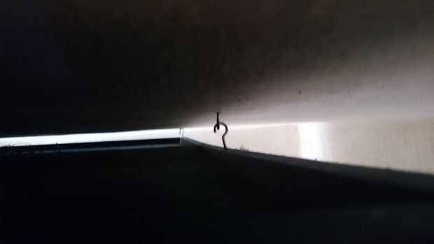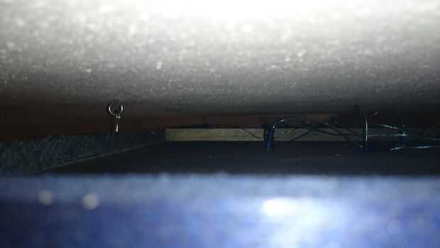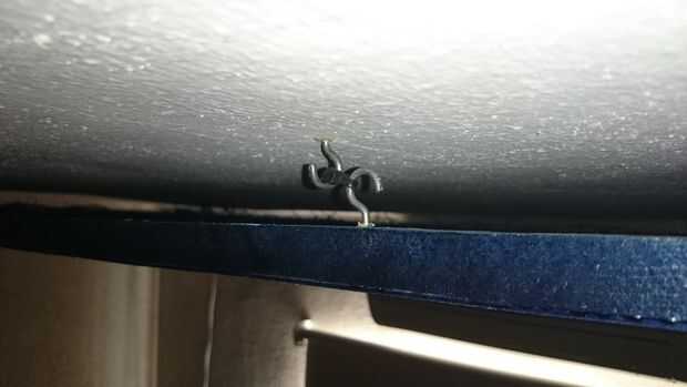 Una vez colocado y todos los detalles del cielo, algunos picos u ojales de gancho en la parte posterior y en el techo. Hice agujeros en el techo para colocar una clavija de madera porque no tengo taladro tan profundo porque los picos no son tan profundos y taquete de plástico no habría funcionado y cuanto peso no es ningún problema.