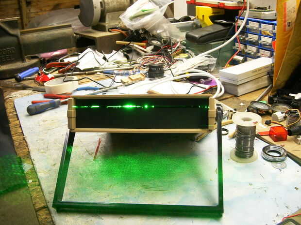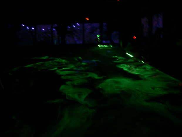 Produce una hoja plana de luz láser, el humo remolinos alrededor en movimiento siempre patrones.