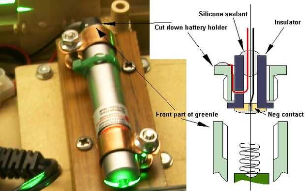 El dibujo muestra una solución, que cortar la parte posterior del láser apagado justo detrás de la rosca, encuentra un aislador plástico "sombrero" que sólo cabrían en el cañón de láser. El contacto negativo del latón es la cabeza de un tornillo de madera de latón con un agujero perforado en el mismo para el cable. Se suelda el cable positivo al corte hacia abajo de soporte de la batería. Tenga en cuenta que la polaridad del voltaje es negativa al módulo y positivo para el caso, red y blu ray diodos al revés.