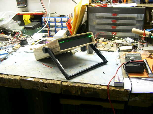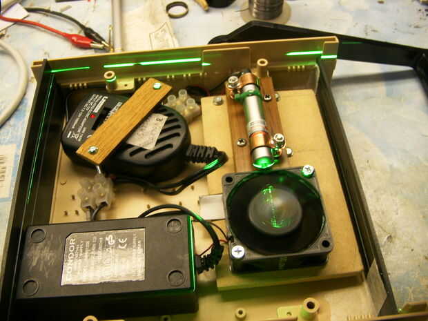 La caja de plástico tiene un panel frontal que corté por la mitad, me quedé a la mitad a la base, pegado la otra mitad en la tapa para que cuando el caso fue montado había una rendija estrecha donde emerge el haz.