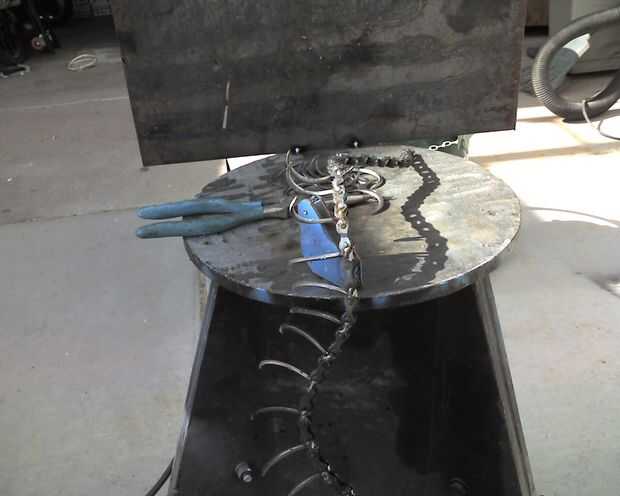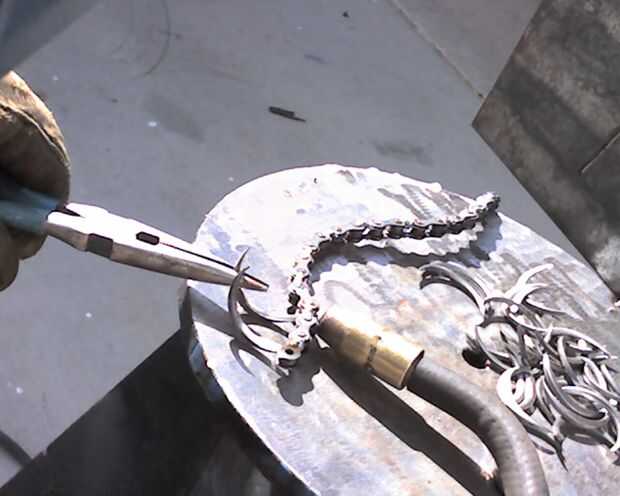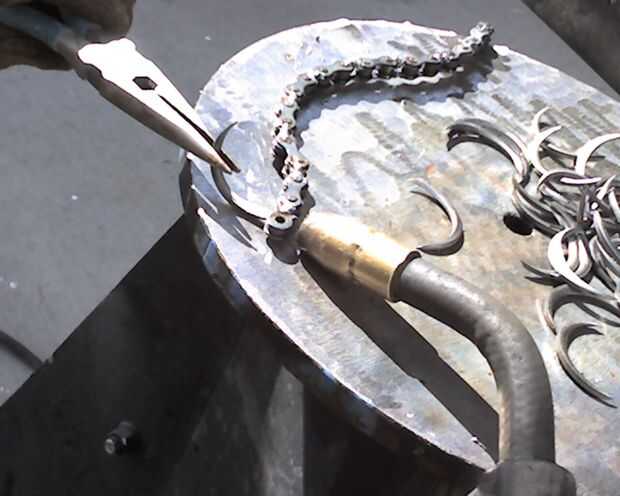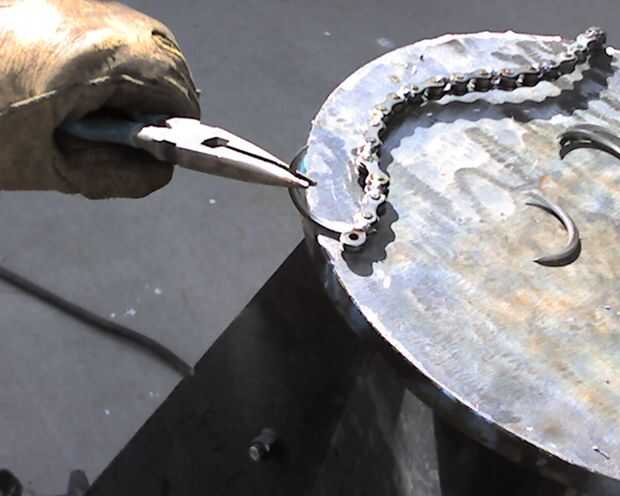 Un par de pinzas, sujete con la punta enderezada de la pierna a través del cuerpo y soldar por el lado opuesto. Traté de llenar completamente el orificio en el eslabón que fortalece el cuerpo.