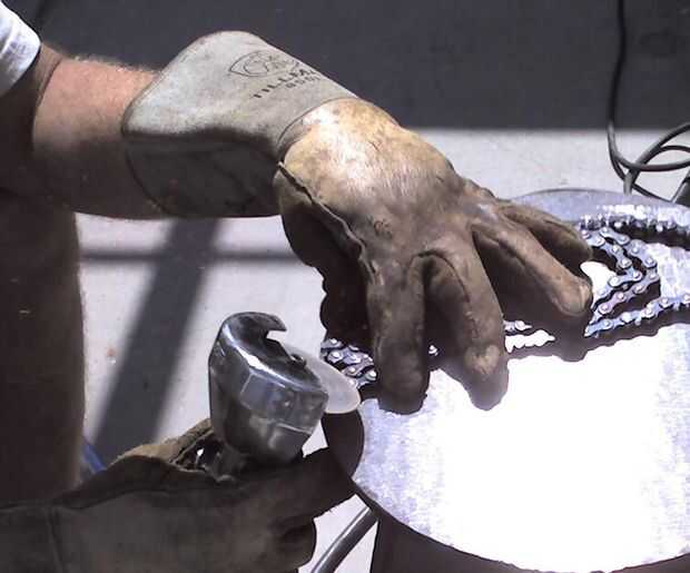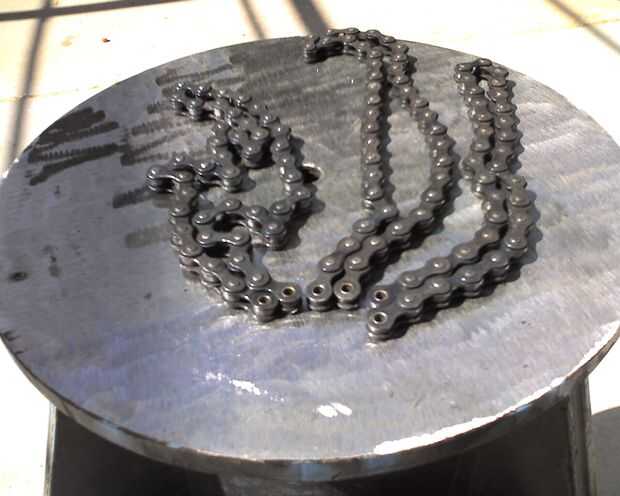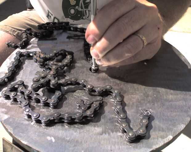 Alinee la placa exterior de la cadena sobre un agujero en su superficie de trabajo o yunque tan cuando el perno es conducido a través de él caerá por el agujero.