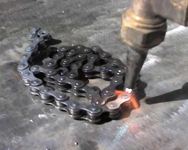 Utiliza la antorcha para calentar la cadena y quemar el aceite. Usted quedará con una capa gris de ceniza y una cadena lista para soldar.