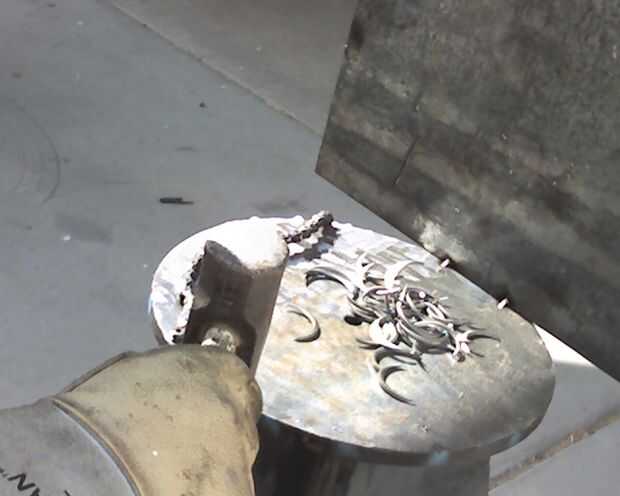 La curva de la huelga con el martillo (bingy bangy) por lo que aplana la curva. Si el borde de la superficie de trabajo deja un ding en el borde interno de la pierna, vestido el borde afilado de la superficie de trabajo con una amoladora.