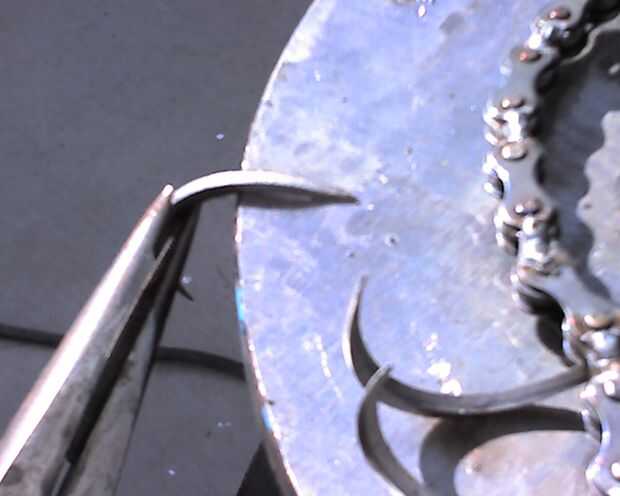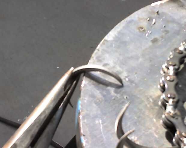Sostenga la pierna contra el borde del yunque (o superficie de trabajo resistente) con un par de pinzas por lo que es un poco pequeño de la curva que se pega para arriba.
