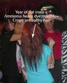 Daños causados por el exceso de procesamiento --pasó por un período donde yo estaba usando tintes de caja farmacia áspero cada 3 semanas o así, tratando de mantener el color super brillante. Lo que no me di cuenta fue la razón que mi cabello no era capaz de mantener el color ya era porque me estaba muriendo demasiado a menudo. El amoníaco había maltratados mi pelo tanto que la cutícula puede no estar condicionada liso otra vez. Moléculas de color y humedad no tenía medios de bloqueo y se lavarían lejos muy rápidamente. Esto dio lugar a la corte de aproximadamente 5 pulgadas de pelo super crujiente y una moratoria sobre los tintes de droguería para más de un año para crecer detrás. Permanecer lejos del amoníaco por un tiempo ayudó a mi cabello a recuperar la salud y la capacidad para retener el color más eficazmente.