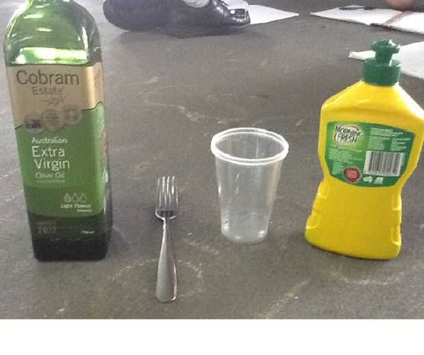 Materiales: Horquillas, agua, aceite de oliva, 2 plástico ver-lanzaron tazas, detergente.
