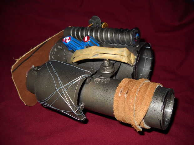 esto es arma de ciencia ficción de la prop. Este se compone de1. Forex (cartulina como material).2. plásticos tapas.3. tubo de aluminio como barril.4. cuadrado tubo metálico como titular/carrier(which is welded in L-shape inside & fixed in a ply-wood