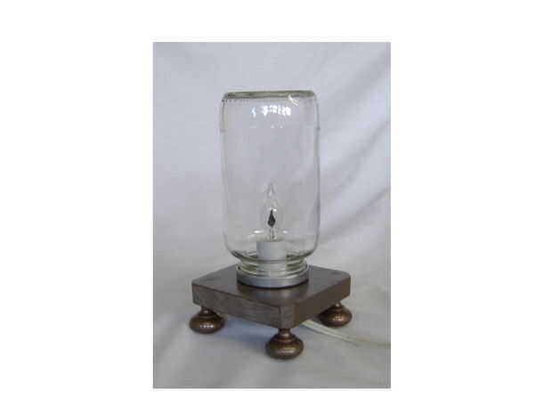 Para la base, tomó un trozo de madera sobrante cortar a cuadrados de 4" y taladrar un orificio de 1 1/8" en el centro. También perforé 1/8 agujeros en las esquinas, para los tornillos que se sujetan los pies. Yo había avellanado los orificios por lo que se podría cubrir la cabeza. Ran los pernos en y cubre los agujeros con masilla de madera. Cuando la masilla curada, había lijado nivel. Luego pinté la base con tres capas de pintura de bronce martillada. La tapa de la jarra fue perforada con un agujero de 1 1/8", pintada con la misma pintura y atornillada a la base, alineando los agujeros. El accesorio de iluminación real fue a través de este orificio y asegurado con tornillos pequeños. Yo luego atornillar los pies de la perilla de latón en la base. Ahora necesitamos el mundo!