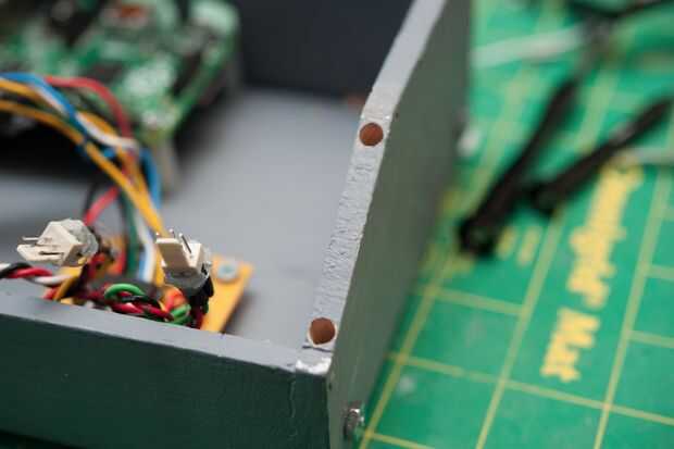 Taladre los orificios en la parte superior y borde delantero, dependiendo del tamaño de su montaje de la Motherboard, Tarjeta madre o separador utilizado en ángulo. Tuve que usar dos tamaños de orificio diferentes, primero un agujero más estrecho para el tornillo inferior del pilar, a continuación, un agujero un poco más grande para la parte superior del separador, un poco de pegamento de madera mantenga en su lugar. Usando un taladro hecho obtener la correcta profundidad bastante fácil