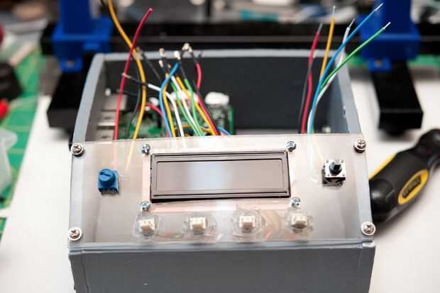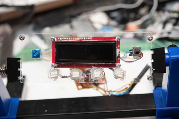 Perforar el plexiglás para los componentes analógicos (tenia 4 pero el chip soporta hasta 8) conectados con el conector de 3 pines, el potenciómetro y el botón de navegación de 5 manera. Desea medir y cortar un rectángulo de la pantalla LCD.