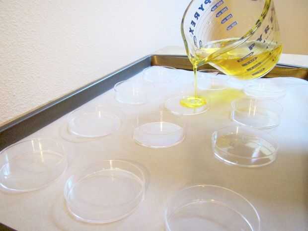 Coloque un pedazo de papel encerado o papel de pergamino hacia abajo en una bandeja para hornear galletas. Esto ayudará a tus platos de petri permanecer en el lugar y le permiten ver el color más claro.