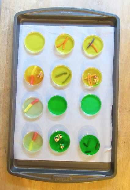 Poner la galleta forrada hoja y gelatina de Petri en la nevera y permitir una refrigeración durante 2 horas.