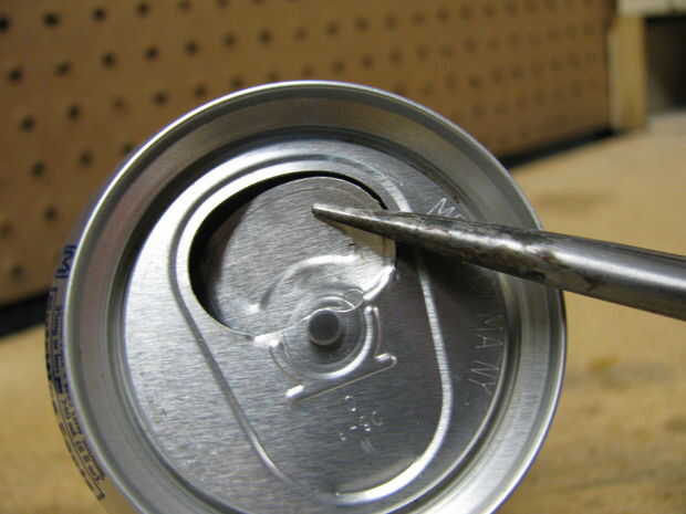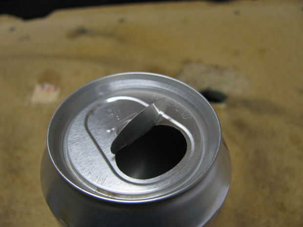 A continuación, encontrar la tapa del orificio de desembocadura dentro de su poder. Haz tus pinzas allí y tratar de agarrar el borde más cercano a donde se une a la lata. Podría tomar un poco de ondulación, pero debe poder doblar la tapa del orificio de desembocadura por lo que es totalmente fuera de la lata sin romperlo.