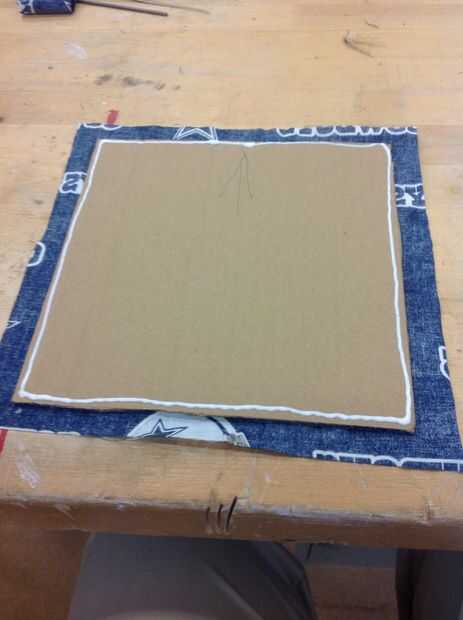 Tomar elmers pegamento y pegar la tela al cartón cuadrado.