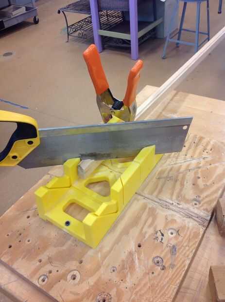 Cortar 4 piezas de madera de pino 10.5x1.5 con un backsaw en un box.l de ingletes