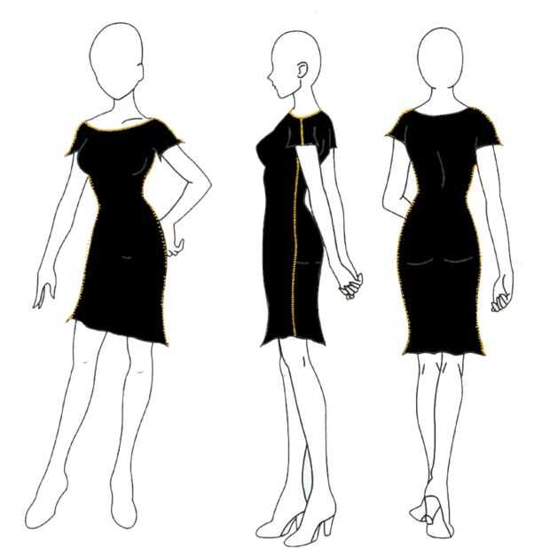 Primero empecé por limpieza de la plantilla un poco, quitar características no es importantes el diseño que le quita el vestido siendo el principal punto focal. Yo entonces ligeramente bosquejó una forma para el vestido sobre la plantilla hasta que estaba contento con la forma en que veía. A continuación color en mi diseño con el color de la tela, elegí utilizar y añade oro guiones para representar donde quería mis cremalleras a colocarse el vestido. Luego imprimí y lo llevaron alrededor de todo el proceso a utilizar como referencia.