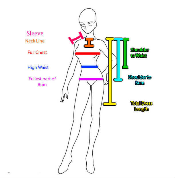 Para la medida de la manga (si quieres mangas) medido desde el punto medio entre la punta del hombro y el centro del cuello, abajo del hombro hasta el punto que quería el manga para parar.