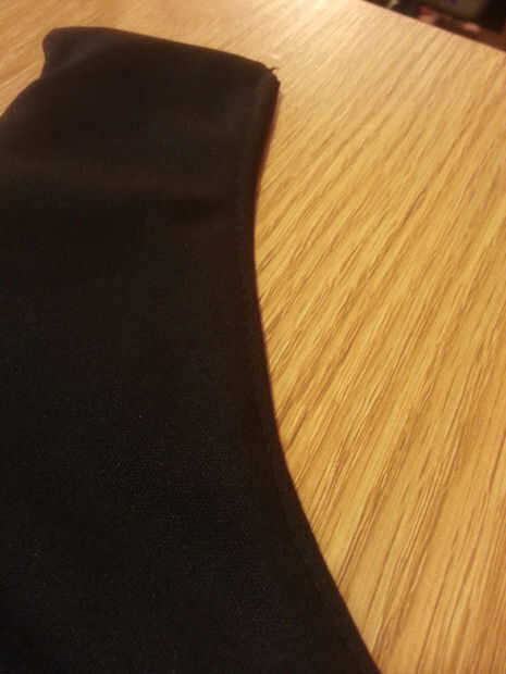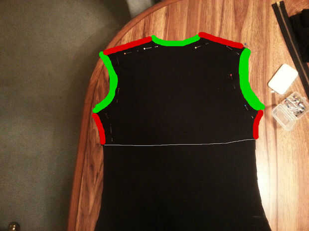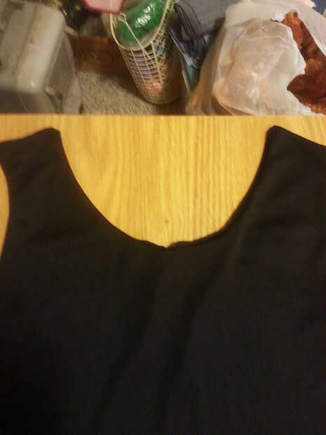 Una vez las costuras laterales coser una puntada de sastres a lo largo de los agujeros del brazo y el cuello. Esto evitará que al tejido voltearse cuando el vestido es usado, mantener el revestimiento en su lugar. Esta costura será una costura de 1/8". Cuadro 6
