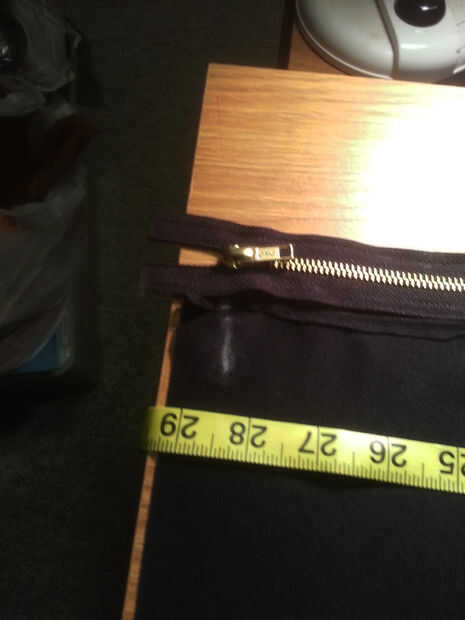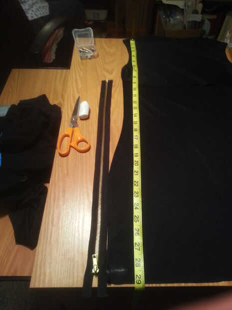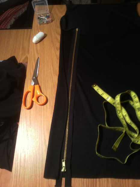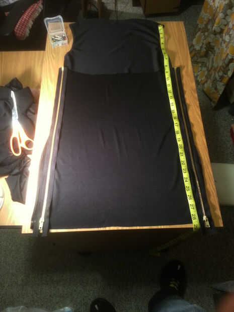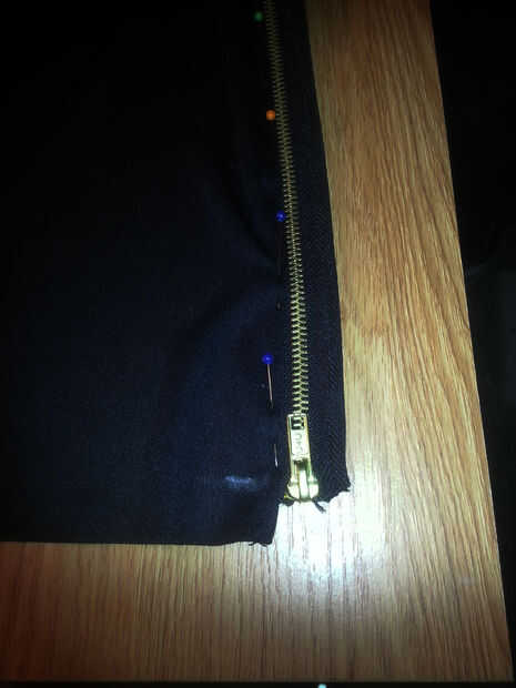 En este paso colocar y coser las cremalleras más largo en las costuras laterales del vestido. Mida desde la parte superior de la tela a la longitud que la parte inferior del vestido en y una marca de tiza. Esto es donde estamos colocando la rebordeadora parte de la cremallera (nuestra cremallera se descomprime desde la parte inferior, arriba). No corte a la tela de acceso. Dejamos el espacio en la parte inferior para el margen de dobladillo más tarde. Fotos 1, 2 y 3