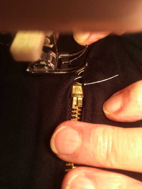 Con o sin un pie de cremallera estaremos usando una puntada recta, costura de espalda al principio y al final de la puntada. Hacer esto para ambos lados de ambas cremalleras. Fotos 7 y 8