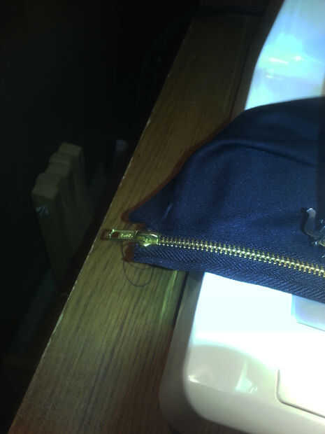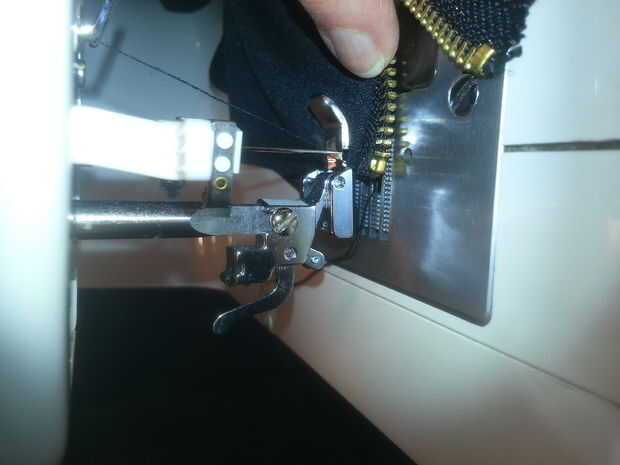Si tienes un prensatelas para la máquina de coser te recomiendo usarlo. Esta pieza tiene la forma para permitir un cierre pasar casi directamente al lado de la aguja sigue aplicando tensión a la tela. Fotos 5 y 6