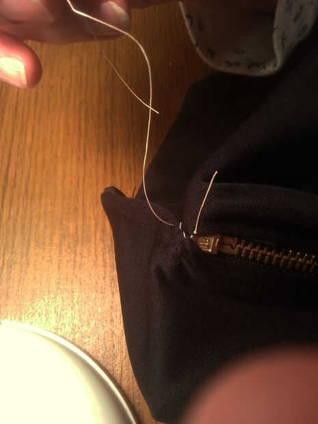 Después de tus cremalleras son totalmente cosidos y el vestido en una pieza grande con cremallera impresionante costuras necesitaremos cubrir la parte superior de las cremalleras. PIN o coser a la tela a cada lado de las cremalleras con una puntada de la mano en el extremo más superior de la cremallera por el frente y la parte trasera del vestido. Básicamente nos estamos pellizcando la parte delantera y trasera del vestido junto directamente sobre la cremallera. Usted puede Agregar un trozo pequeño de tela aquí si quieres, pero para mí, pellizcos y coser a la tela a mano y luego coser directamente a través de ella con la máquina funcionaba bien. Una vez que usted decida qué camino desea cubrir la cremallera termina, coser la cubierta como lo hice o con una pieza adicional de la tela. Saque la puntada de la mano una vez que la tela se cose.