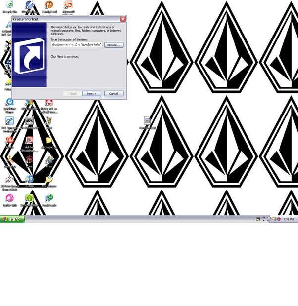 después de hacer clic en acceso directo que aparece en una ventana se escribe: shutdown -s -f -t 10 - c "un mensaje iría aquí"... (Asegúrese de que sus cotizaciones en) haga clic en siguiente