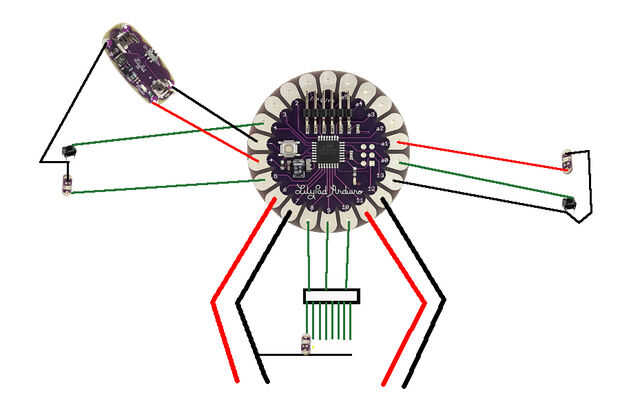 Para cualquier proyecto, siempre es bueno empezar a bosquejar cómo conectar tus aparatos electrónicos.    Yo he conectado mi bosquejo abajo.  Observe la línea verde desde el interruptor de botón izquierdo cruza las líneas positivas y negativas de la fuente de alimentación.  Esto sucedió porque yo realmente no esboce un diagrama de cableado antes de empezar.  Sin embargo, era fácil de coser sobre las líneas aislando el hilo con los granos no conductores.  Esto se demostrará en pocos pasos.  Por ahora vamos a colocar los componentes en la sudadera