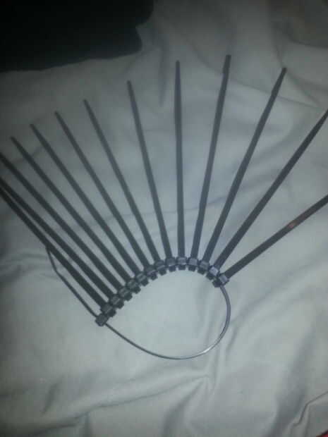 Ahora toma tus otros lazos zip y ponerlos alrededor de la base amarra uno a la vez. Más no creo que este solo hace que allí todo va igual. También desea que la parte del conector zip para ser hacia fuera. No estoy seguro cuántos le toma para completar depende del tamaño de la muñeca. Puede usar otras ataduras de cremallera de color entre los lazos del cierre relámpago negro.