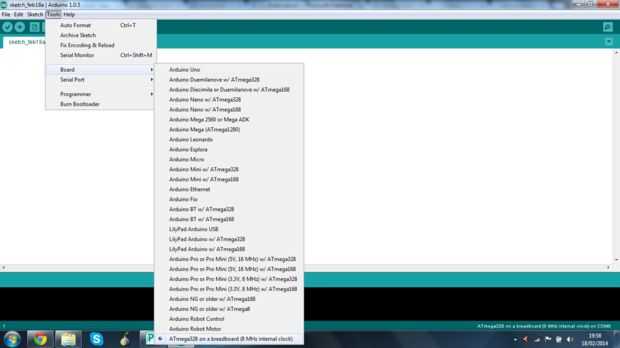 Inicio/reinicio usted programación entorno de arduino y usted debería ver en tableros de herramientas una nueva entrada llamada arduino en protoboard