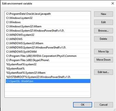 • Haga clic en nuevo y escriba en C:\OpenSSL-Win64\bin si está ejecutando Windows de 64 bits, tipo de C:\OpenSSL-Win32\bin si está ejecutando Windows de 32 bits. Seleccione Ok.