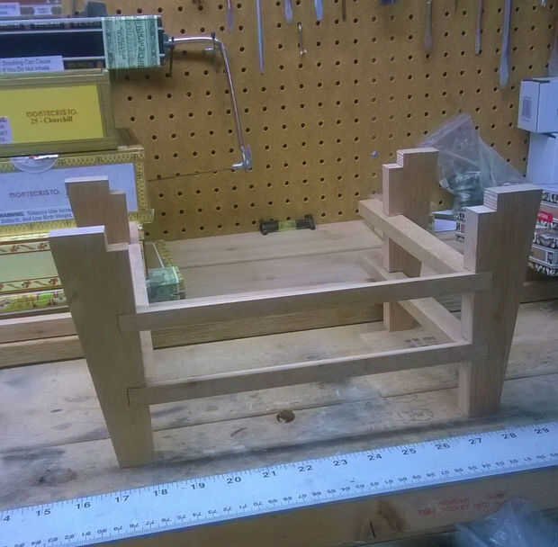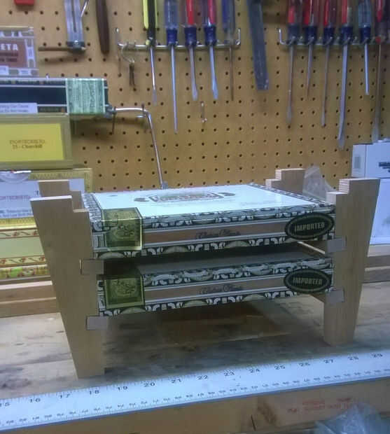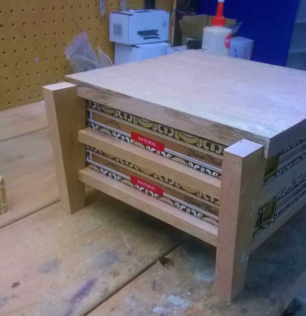 Por último pegué todo juntos, usando la parte superior para ayudar a mantener la Plaza. He añadido los rieles traseros, que simplemente se sientan encima de los rieles laterales y al ras con las patas traseras. Los rieles traseros sirven dos propósitos; más rigidez en el diseño y para mantener las cajas de cigarro de caer hacia la parte posterior.