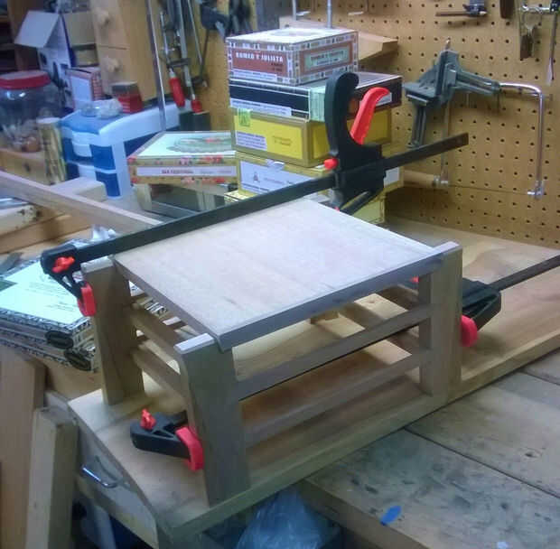 Después de algunos mandados volvió y prueba de ajuste de la pegado piezas, hizo luz lijar otra vez y luego nos dispusimos a pegamento para arriba como una sola pieza. Esto es cuando me di cuenta que no había hecho aún la parte superior. Tan medido y efectivamente era la parte superior 10 1/2" por cerca de 10". Con cuidado cortar y montar la cosa entera otra vez para ver cómo estaba buscando.