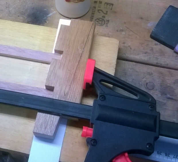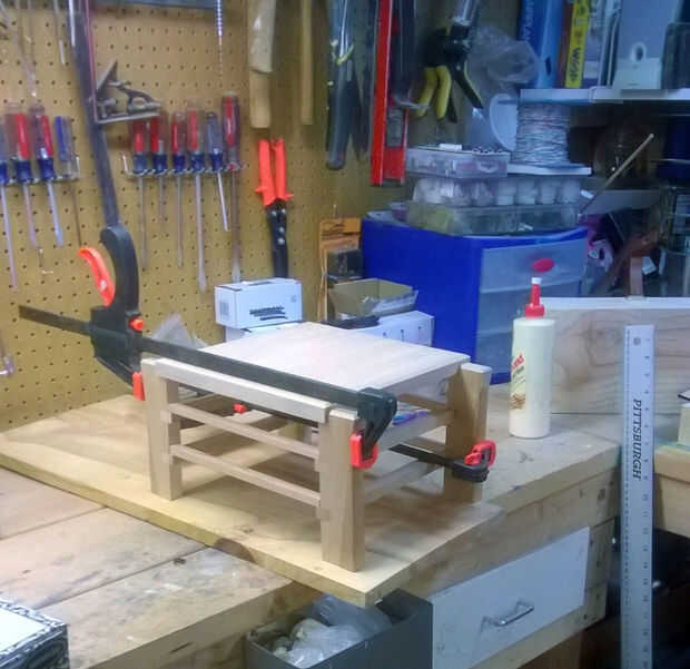 Primero coloqué las patas delanteras dos y el frente guías sobre un tablero plano y pegado, usando una pinza para aplicar una pequeña cantidad de presión que celebrará las piezas en forma. La madera de desecho guarda de cuando las piernas fueron cortadas son buenas aquí porque puedes temporalmente "agrega detrás" mientras es sujetada y la pinza tendrá más fácil. Comprobar la tercera foto de arriba para un cierre de lo que quiero decir.