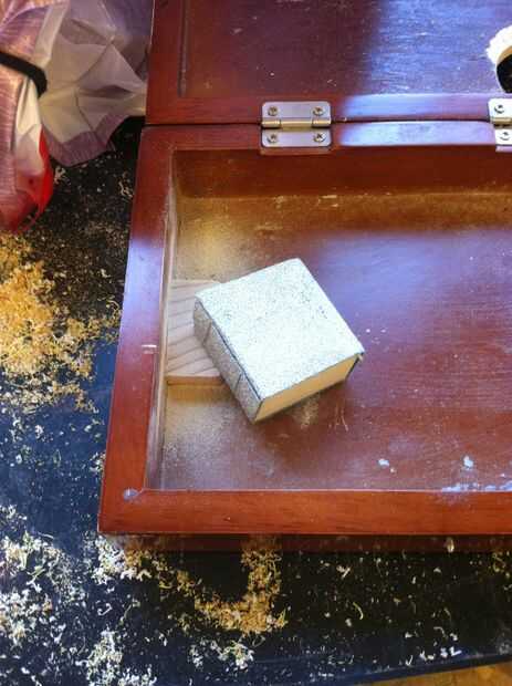 Para este paso utilice la madera extra que fue cortada al tamaño del cuello. El bloque de madera tiene que ir desde el fondo de la muesca al final de la caja. Después se cortan pegamento en lugar de madera del pegamento y sujetarlos. Si no se puede cerrar la caja con el cuello de la guitarra dentro, no lijar un poco.