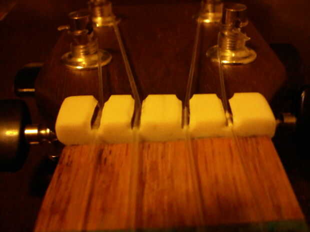 Utilicé una combinación de una sierra de banda, dremel y lijadora eléctrica para formar mi tuerca y silla de montar. Sacar una guitarra o mirar alrededor de ukelele para tener una idea de lo que usted necesita. Una idea importante aquí es acción - es decir, la altura de las cuerdas sobre los trastes. Es difícil obtener una buena idea de la acción, mientras todo está todavía suelto y no poner juntos, dejar que corte las ranuras hasta más tarde.
