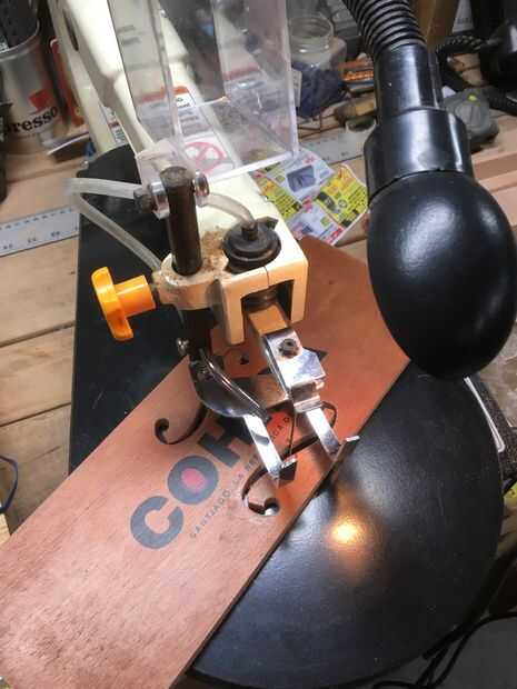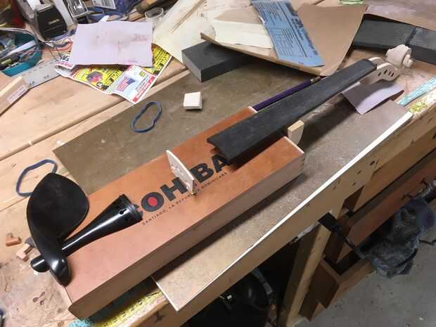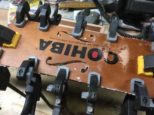 Ahora tengo un cuello que es la longitud adecuada y un top bonito listo para ir! Hice un ajuste de prueba y está buscando bien... Descargué algunos f-agujeros de internet, tamaño en PowerPoint e impreso en papel normal. Luego pegar a las guías de la tapa con pegamento de aerosol de Elmer y cortar los f-agujeros utilizando una sierra de contornear. Después de eso, quité el papel restante con un solvente y todo fue increíble hasta...