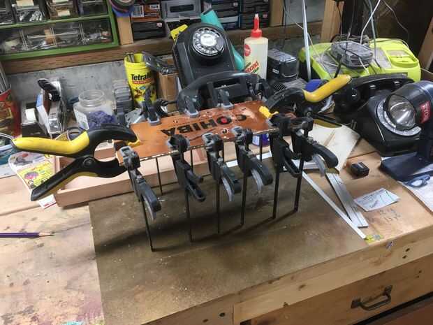 FIX: Tenía una cerveza y vi una película. Luego pegué las dos mitades de nuevo juntos y cuando se seco estaba alterado. He puesto un ladrillo pesado sobre ella durante una semana. Era plana pero parecía horrible. Arena lo mejor que pude, luego dio una rápida capa de goma laca spray. Es increíble lo que goma laca puede cubrir...