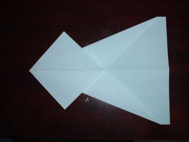 bueno... revelar lo que hiciste en el paso dos.  Ahora voltea el papel al lado opuesto y hacer el doblez del aeroplano marca otra vez.  Voltea el papel otra vez.  Ahora... mira las fotos... Tome el lado hacia fuera los bordes del aeroplano doblan y traen al redil centro... no doble las solapas que hiciste con el doble de avión!!!!