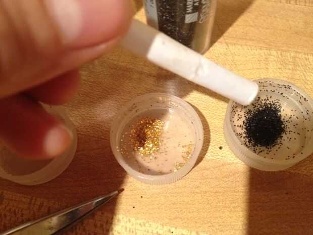 -Alternar sumergir la punta, con el pegamento mojado, primero en negro, luego amarillo y finalmente naranja brillo. Que tenga que añadir un poco de pegamento e ir y venir entre los 3 colores para conseguir que se vea apenas a la derecha. Tenga cuidado de no aplastar la punta en el proceso, como todavía ha mojado la cola y espacio extra.