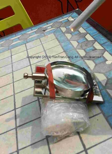 Figura 5: latente usando un lente y un espejo. Figura 6: Ardiendo con el pulido, esférico jefe de una cuchara sopera de acero inoxidable.