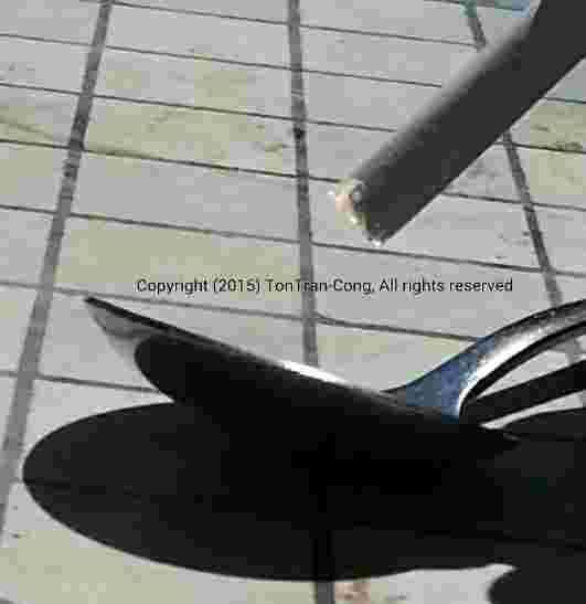 Ardiendo lleva 5 segundos y 12 segundos respectivamente para el sistema de la lente y el espejo y la cuchara esférica bien pulido. La cuchara no tiene una forma esférica exacta y su luz del sol reflejada no está bien centrada.