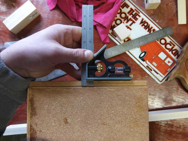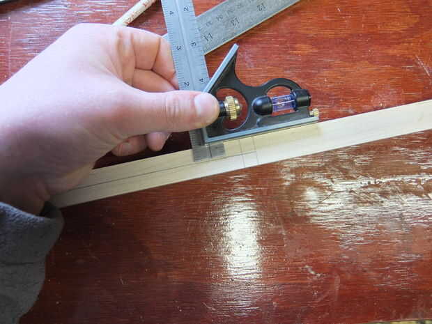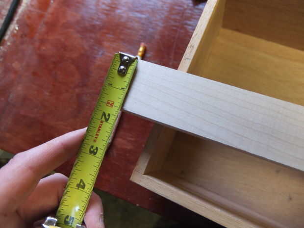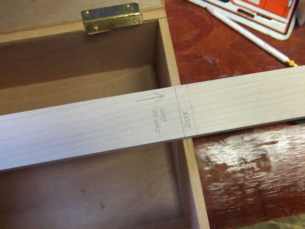 Usted también tendrá que marcar la pared de la caja para indicar el centro. Esto le permitirá al centro la Junta del cuello mediante el cuadro de ángulo recto. Medir la caja de dentro a dentro y marque el centro exacto. Luego Mida y marque 0,75" en ambos lados de esa marca de centro. Esto indica que la dimensión de 1.5" de la neckboard.
