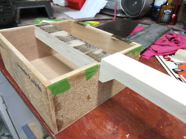 Medir el espesor de la tapa de la caja de cigarro utilizando una regla. Que desea eliminar que mucha madera de la Junta del cuello de la "culata" poner fin a la marca "fuera de caja". Esto permitirá que la superficie superior del cuello quedar al ras con la tapa de la caja de cigarro. Marcar el espesor de la Junta del cuello y cortar con una sierra o martillo y cincel. Probar el ajuste y la nueva superficie lisa de la arena.