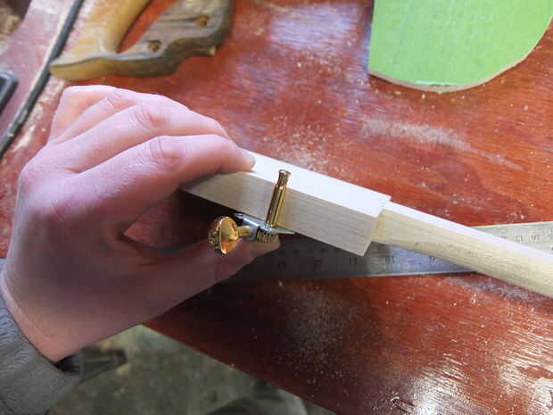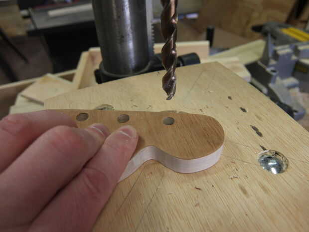 Marque y taladre 3 agujeros en el cabezal de los clavijeros. Dependiendo de donde llegar ellos y el tipo pueden o no pueden tener un casquillo para el puesto. Os animo a probar en un pedazo de madera de desecho para averiguar el diámetro de los agujeros. Desea que los puestos a ser apretados y no meneo.